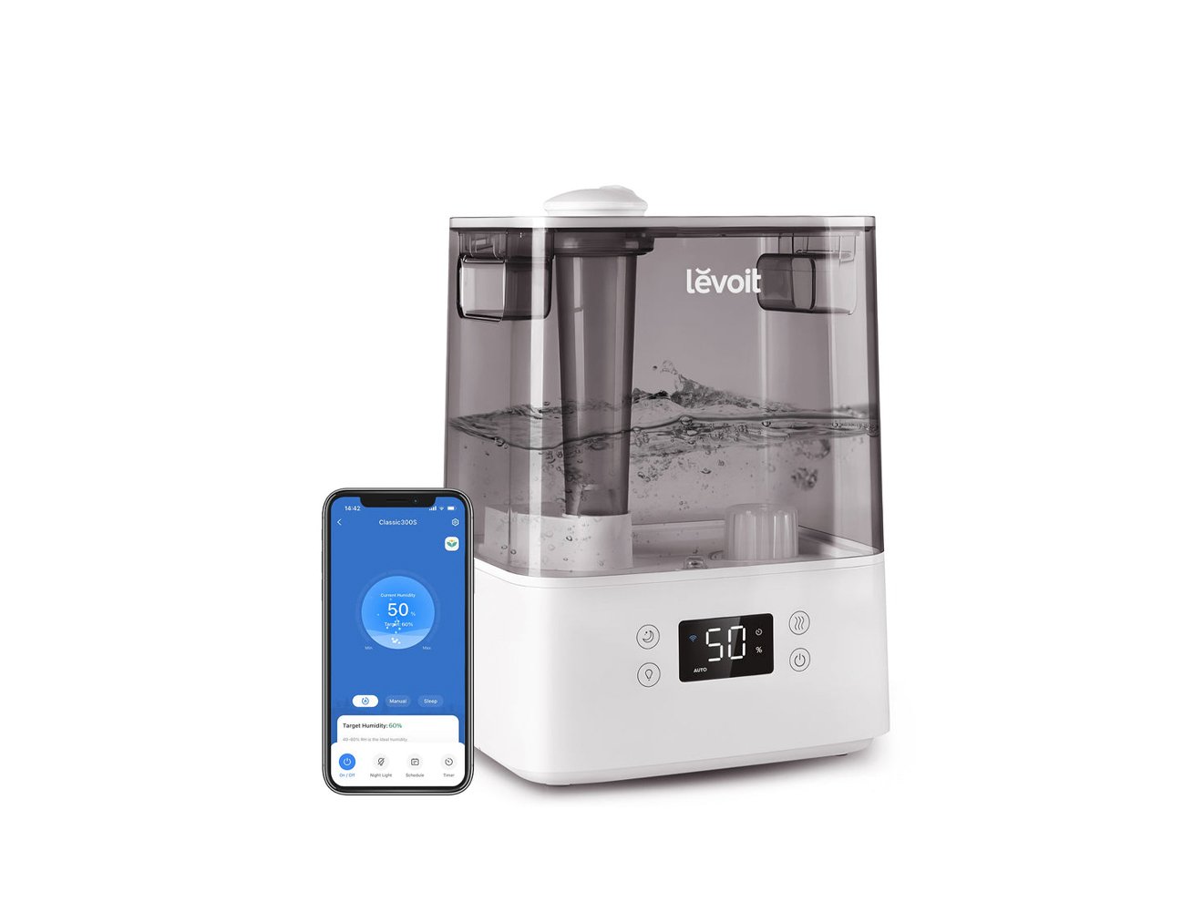 Enjoy full control of your humidifier from your phone. With VeSync, you can monitor your humidity, select settings, use voice control, and create schedules and timers for your humidifier.