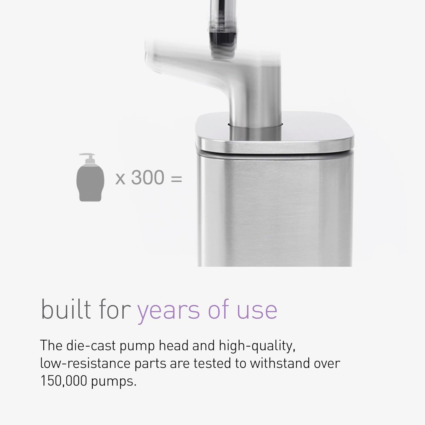 The simplehuman stainless steel pulse pump is engineered from the inside out. Its innovative design includes a large pump tube that allows for greater soap or sanitizer flow – no matter how thick – with far less effort. Ball bearings located at the top and bottom of the pump keep air from entering, which prevents soap from dripping, leaking or drying out. Just a light touch on the spout provides a generous portion of soap – and it’s designed to last more than 150,000 pumps – that’s over 15 pumps a day for 27 years. Fast, neat and nearly effortless, it is a uniquely satisfying experience.