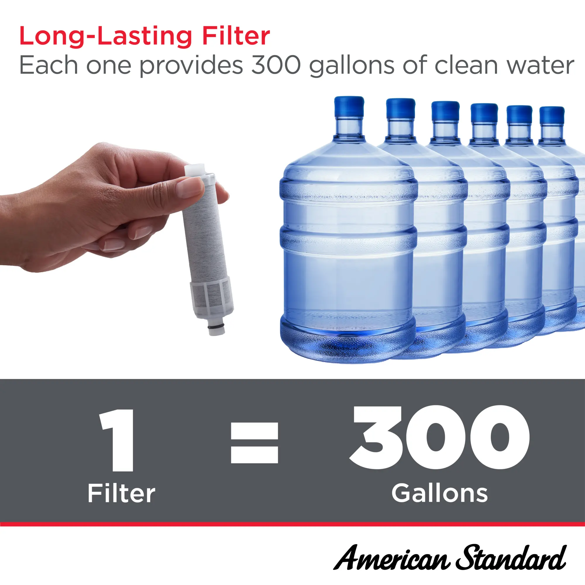Each filter provides 300 gallons of filtered water, lasting approximately 6 months for a family of 4 with typical usage