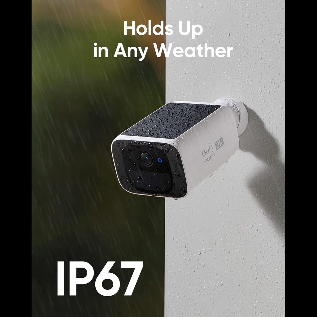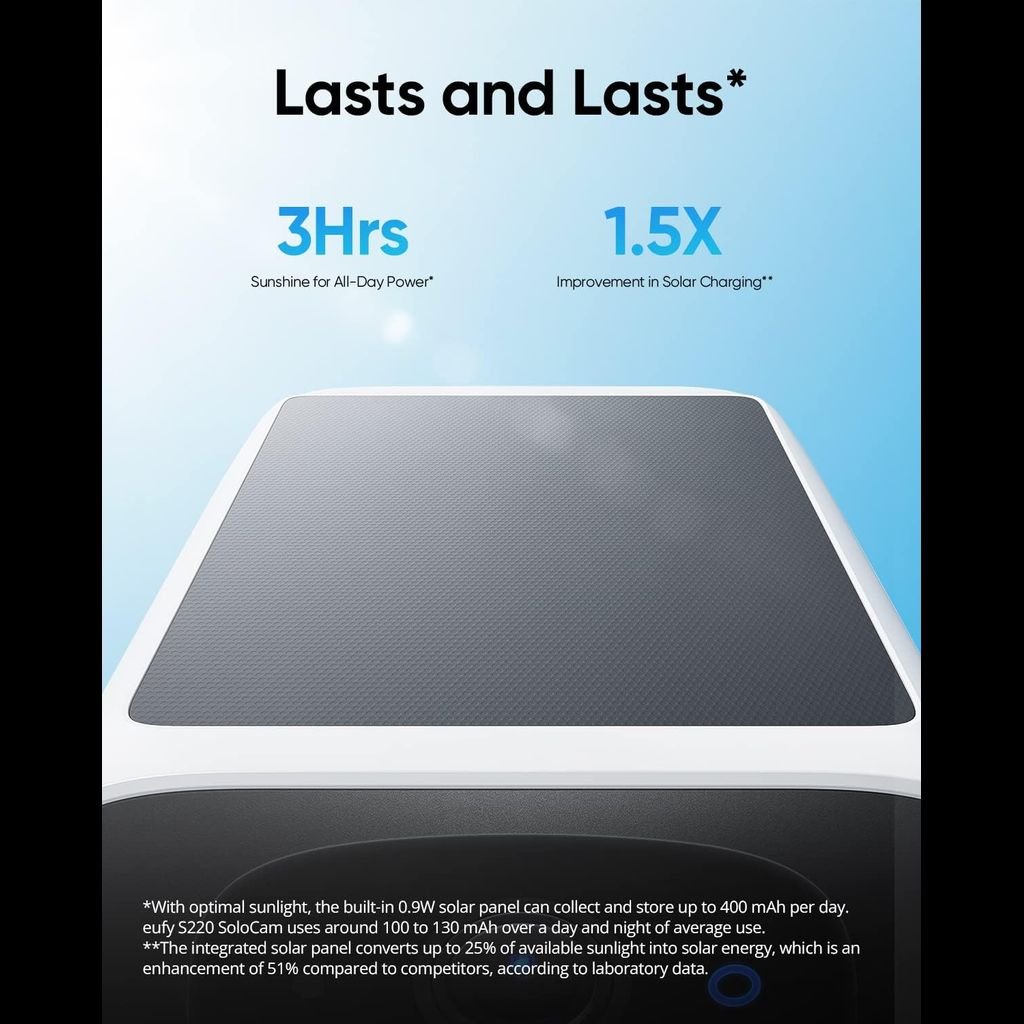 The eufy SoloCam S220 is a compact, wire-free outdoor security camera with sharp 2K resolution for clear day and night recording. It features a built-in solar panel that keeps the camera powered with just a few hours of sunlight each day, eliminating the need for charging. With an IP67 weather-resistant design, AI human detection, two-way audio, 135° wide-angle lens, and 8 GB of local storage, it delivers reliable, subscription-free home security.