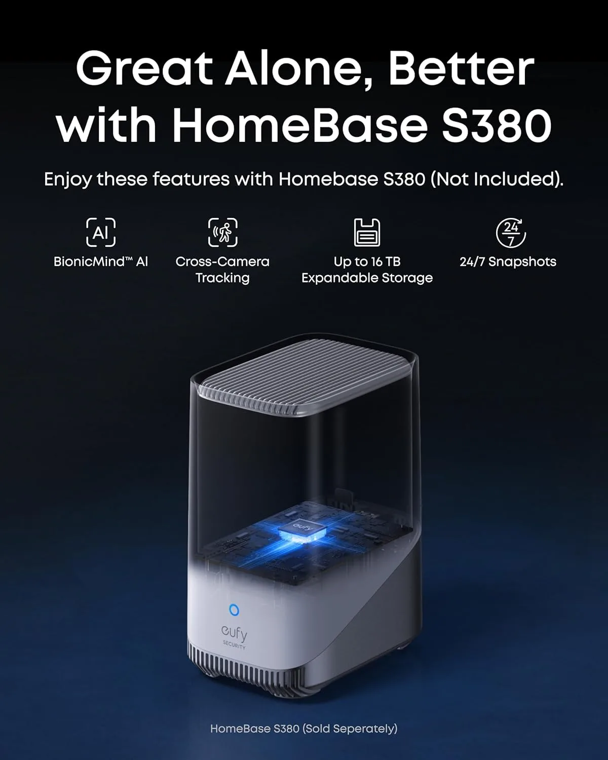 Unlock BionicMind AI to differentiate family from strangers. With 16 GB built-in storage, expandable up to 16 TB, rest easy knowing your videos are stored securely. If you already own a HomeBase S380, please make sure it’s updated to version V3.7.2.6 or later, and your eufy app is updated to the latest version to enable 24/7 recording and Snapshot features.