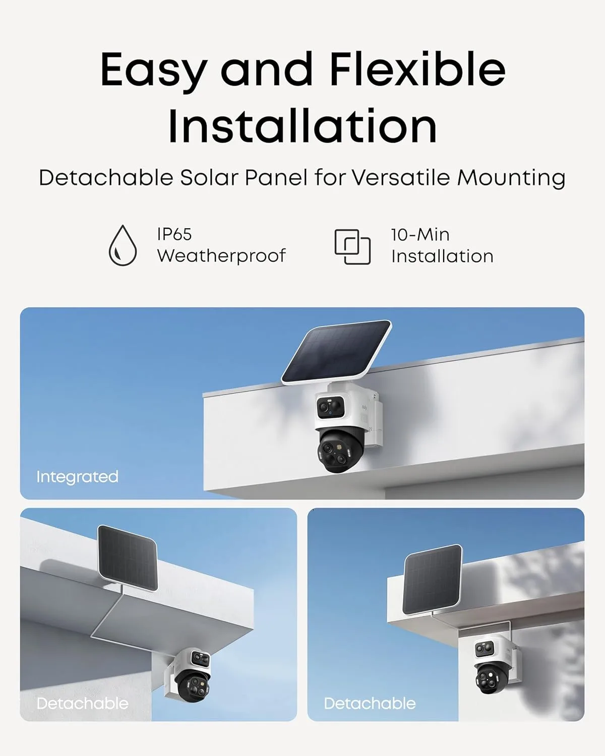 The eufyCam S4 is a cutting-edge outdoor security camera that combines a 4K wide-angle “bullet” lens with a 2K pan-tilt-zoom module for complete 360° coverage. It features radar and PIR motion detection to reduce false alerts, smart tracking of people, pets, and vehicles, and vivid color night vision through built-in LED spotlights. The camera supports local AI processing with no monthly fees and comes with a detachable high-efficiency solar panel that can stay powered with just an hour of direct sunlight each day. Ideal for anyone who wants reliable, full-view home protection with minimal maintenance.