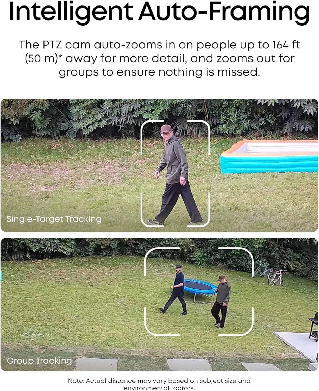 Once the bullet cam detects a subject, the PTZ camera instantly locks on, tracks, and zooms in to capture details up to 164 ft away. When more subjects enter the frame, it automatically zooms out to ensure they all stay visible.