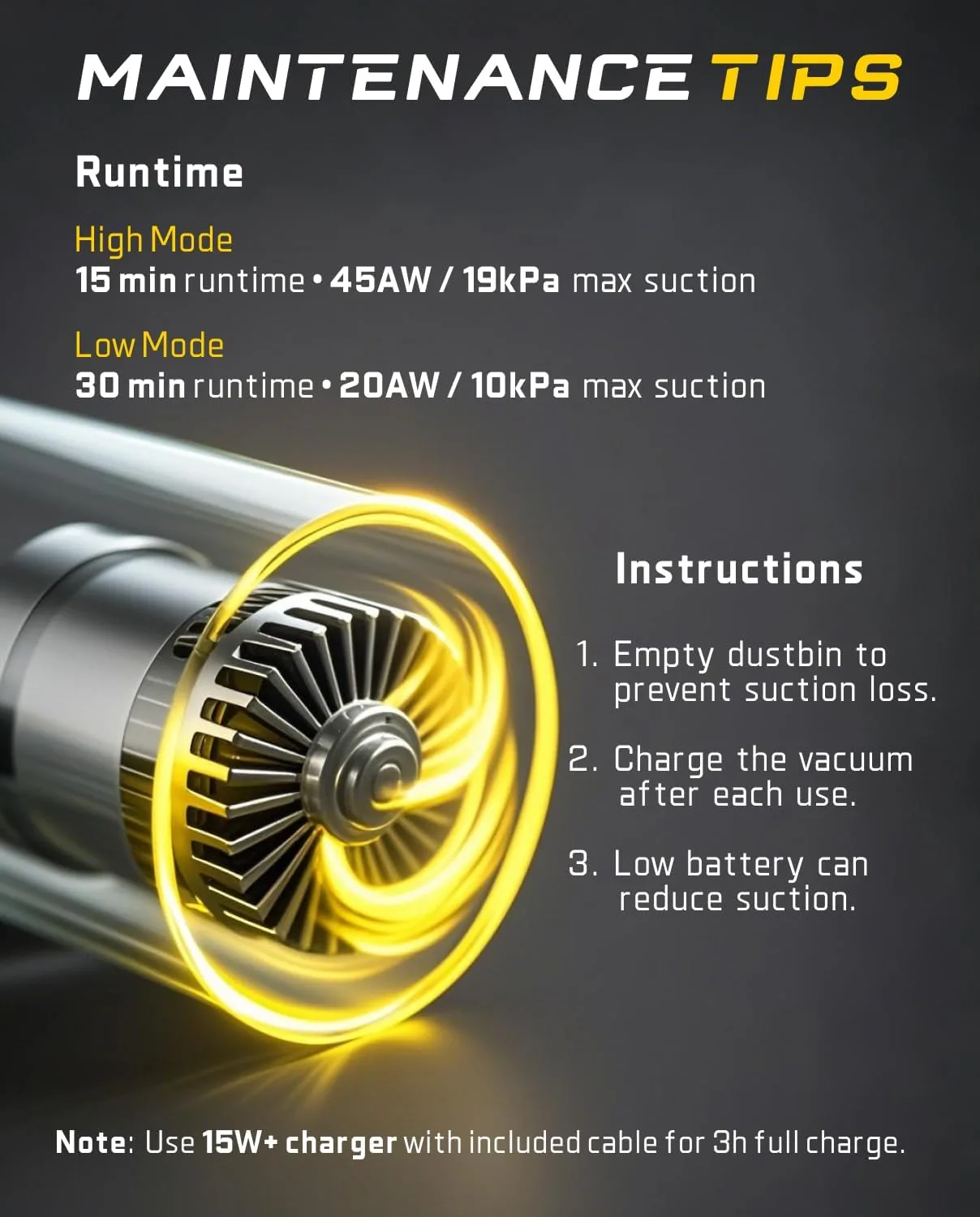 Powered by a 120W brushless motor, it effectively removes dust, hair, and debris. Two modes provide up to 19,000Pa suction in high mode or 30 minutes runtime in low mode, adapting to different cleaning tasks