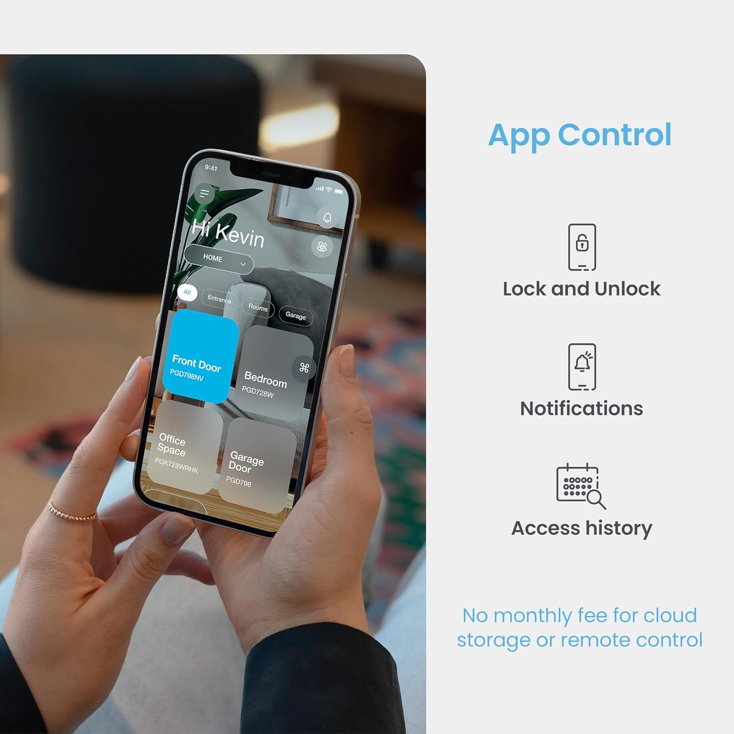 With built-in Wi-Fi, you can use the Lockly Home app with no monthly fees. Lock and unlock your door, see who is home, and create temporary eKeys for guests. You can also use Welcome Mode, set Offline Codes, and use Air Transfer to transfer user profiles within the Zeno Series smart door locks.