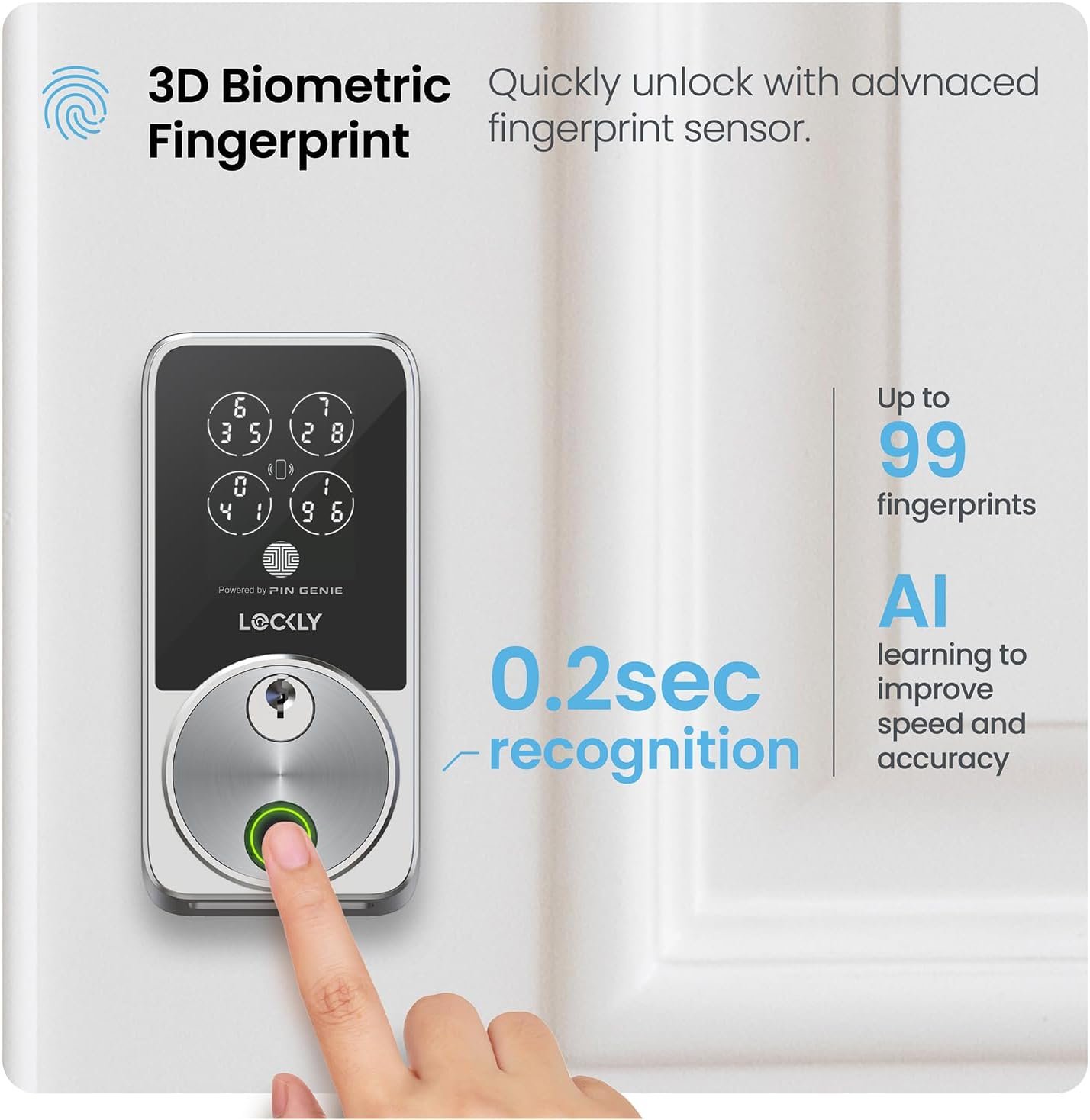 Get quick and secure access with Lockly’s fingerprint door lock. The upgraded 3D sensor, powered by AI learning, recognizes your fingerprint in just 0.2 seconds. It’s easy for everyone to use, including kids and the elderly. Plus, your fingerprint data stays safe on the device.