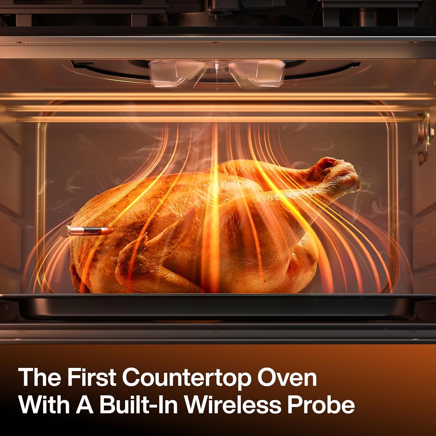 Cook with precision at home using the first air fryer oven with a built-in wireless probe. Tracks core temperature in real time and automatically stops at your desired doneness. Smart Remove-Temp auto-shutoff prevents overcooking and a built-in signal booster keeps readings stable through light foil. No wires, no pairing, no guessing.